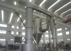 热空气由主机底部进风口切向进入闪蒸干燥机主塔、在闪蒸干燥机主塔内形成螺旋形的上升高速旋转气流,同时根据不同的物料性质调整底部环隙大小,使风速处于合适的状态。物料经螺旋加料器直接进入闪蒸干燥塔,在高速气流的冲击和带动下,迅速分散并随气流作高速旋转运动。对于比较大且潮湿的颗粒团,高速气流不足以使之破碎并高速旋转,于是在重力作用下逐渐下落,当落到主机底部时被设置在底部的破碎装置强行破碎并微粒化,然后随高速气流一并旋转上升而完成干燥过程。为了使物料的终水分达到极低同时不受初水分的波动而影响产品质量,在干燥塔内设置多层旋流片,形成较为稳定的流态化床,同时旋流片亦起到保证干燥所必须的停留时间和分级的作用。
