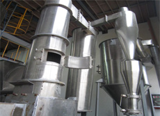 空气经过加热器被加热至~230℃左右,进入旋转闪蒸干燥机。湿料由输送装置送入螺旋加料机构,螺旋加料器可无级调速。物料经挤压后强制进入主塔,随即被高速旋转而又具有不同角度的刀片粉碎,又被高速进入旋转闪蒸干燥机主塔的高温气流冲击高速旋转、夹带上升,这时气流温度急速下降,物料水分迅速蒸发从而完成干燥过程。被干燥的物料随高速高温气流进入脉冲布袋除尘器。气流由滤袋外部进入,向上排出,为防止滤袋积料,由脉冲电磁阀定时、轮流由各滤袋上部输入高压气流(0.5~0.6Mpa),反复反冲滤袋,以达到*佳除尘效果。