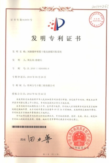 闭路循环喷雾干燥及溶媒回收系统发明专利
