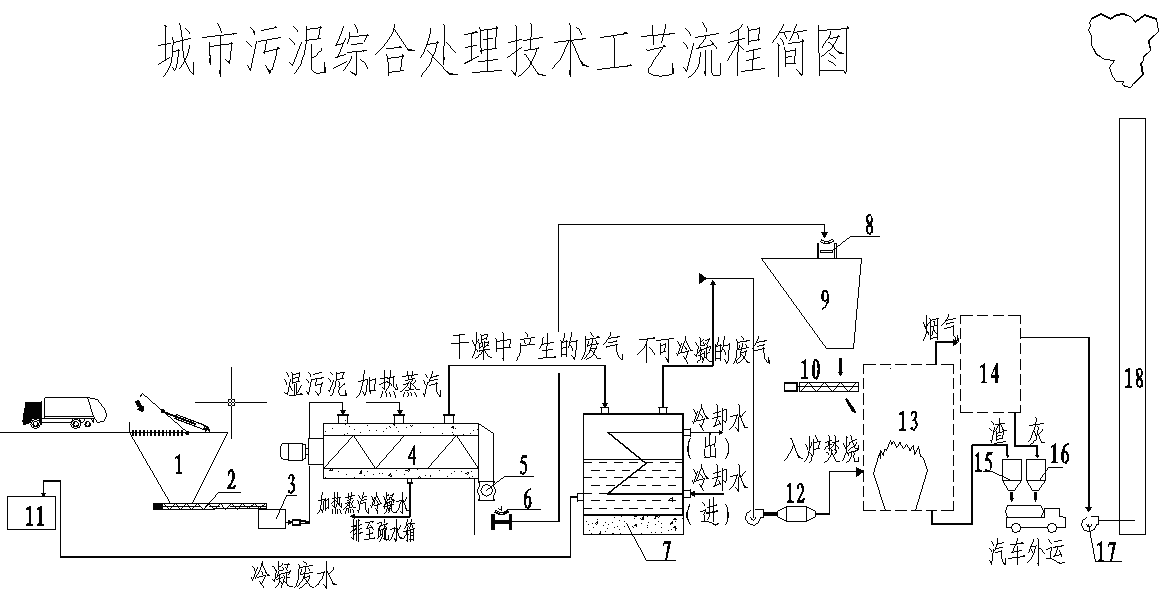 1.污泥仓 2.污泥取料机 3.污泥给料机 4.污泥烘干机 5污泥出料机 6.皮带输送机 7.冷凝器 8.皮带输送机(干污泥)9.污泥仓 10.炉前给料机 11.凝结废水箱 12.锅炉送风机 13.污泥焚烧炉 14.烟气处理系统 15.渣仓 16.灰仓 17.引风机 18.烟囱
